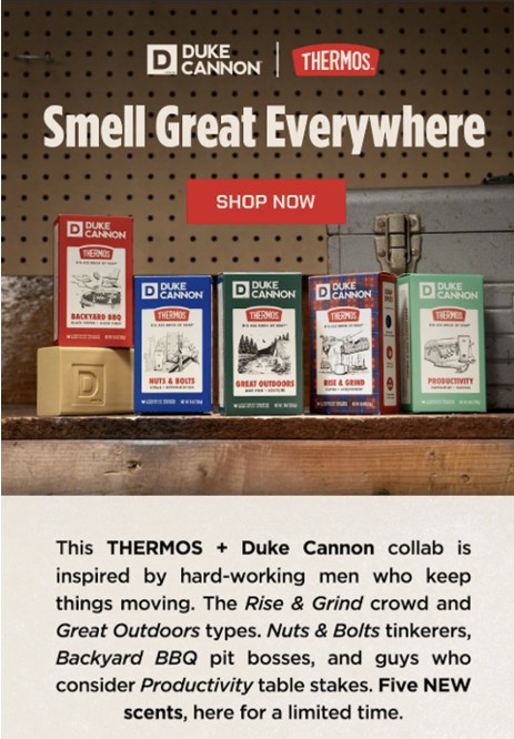 Email and paid social media support announcing the launch of a rugged, utility-driven collaboration between Duke Cannon—a maker of high-quality men’s soaps—and Thermos, a heritage brand synonymous with durability and keeping things hot (or cold) for the long haul. The work leans into both brands’ shared ethos—reliability, toughness, and no-nonsense performance—while delivering sharp, engaging copy built to stand out in overstuffed inboxes and crowded feeds.
